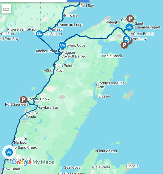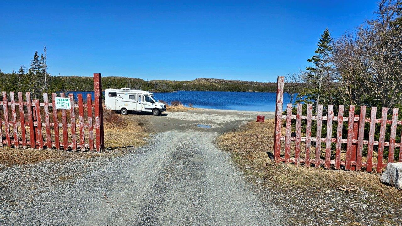 On the next road north, we used the parking lot at the beginning of the White Rocks trail in the village of Flower’s Cove twice as an overnight – on the way north and also on the way back. It is extensive, a small shop is nearby, and the trail is just 1 km long, so you can warm up your legs after sitting in the vehicle. And not to mention that in the even smaller village next door in Green Island Cove, floating icebergs literally create an alley.